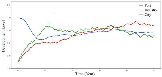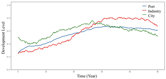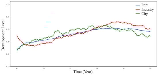 Figure 7 demonstrates the dynamic evolution processes of port, industry, and city subsystems under the industrially endogenous-driven mode. Overall trends reveal that the industrial development level initially experiences slight declines but quickly stabilizes and enters a recovery phase, maintaining systemic dominance between the 15th and 40th years, indicating strong industrial leadership in regional development. The port development level exhibits steady upward progression, gradually approaching industrial levels under industrial pulling effects, demonstrating its adaptive and responsive supporting role in this mode. Urban development also shows gradual growth but with greater volatility compared with ports and industries, particularly displaying post-30th-year declines that reflect mismatches between urban functional development and industrial expansion in later stages, exposing bottlenecks in temporal coordination and support capabilities. Collectively, this mode manifests an “industry-led, port-followed, urban-adjusted” pattern, yet internal coupling remains insufficient, particularly in phased misalignments of urban service functions in supporting industrial and port development.