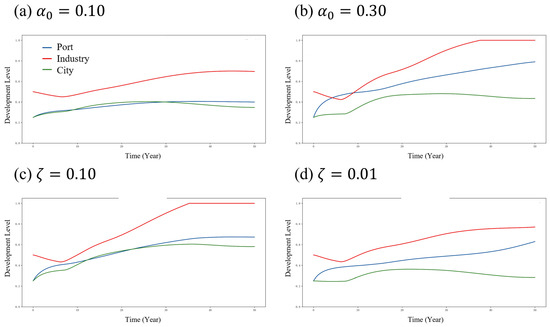 This section analyzes the simulated evolution of port, industry, and city subsystems under the three development modes defined in Section 3.1. By assigning distinct initial conditions to reflect external capital dominance, industrial self-organization, and policy-driven priorities, we trace the dynamic growth trajectories and interaction patterns among subsystems over time. The results reveal mode-specific differences in development sequencing, subsystem coordination, and long-term structural balance. Each of the following subsections presents a detailed account of the trends observed in one development mode, along with sensitivity analysis to identify the key parameters shaping its outcomes.
