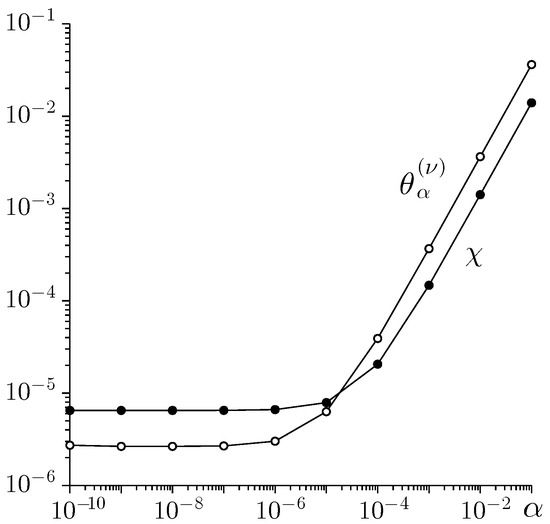 First, we solve the 1D NBVP (6) in the matrix form (3) for different values of the regularization parameter by a direct (Thomas) algorithm (). Figure 1 represents convergence for sufficiently small if the coefficient matrix and the right-hand side vector are given exactly. In general, the divergence of the iterative/direct algorithm has to be expected for because A is the non-invertible matrix.