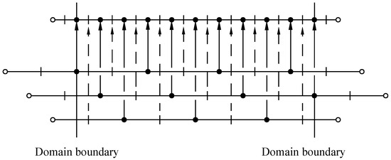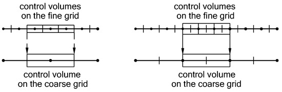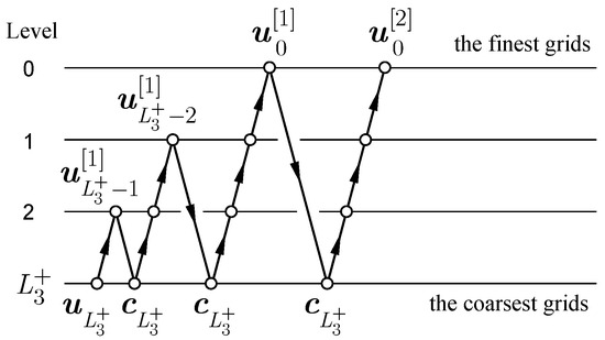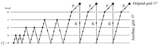 Another problem is the generation of the adaptive grids. In practice, the computational grids are often (locally or globally) refined, and the effect of grid refinement on the numerical solution is investigated for optimal adaptation of the grid to a numerical solution. MLAT is an example of local refinement of the structured grids [18]. The iterative process of the structured grid refinement can be formalized on the multigrid structure. Thus, after the first multigrid iteration on a structured grid , an approximation to the solution on an unstructured grid and a priori information about the unstructured grid (the density of vertices in the region ) are obtained. The procedure for rebuilding the auxiliary grid into the adaptive grid to simplify the intergrid operators and is presented in [12]. An FAS approach allows using the multigrid cycle shown in Figure 14 for solving the nonlinear BVP [12].