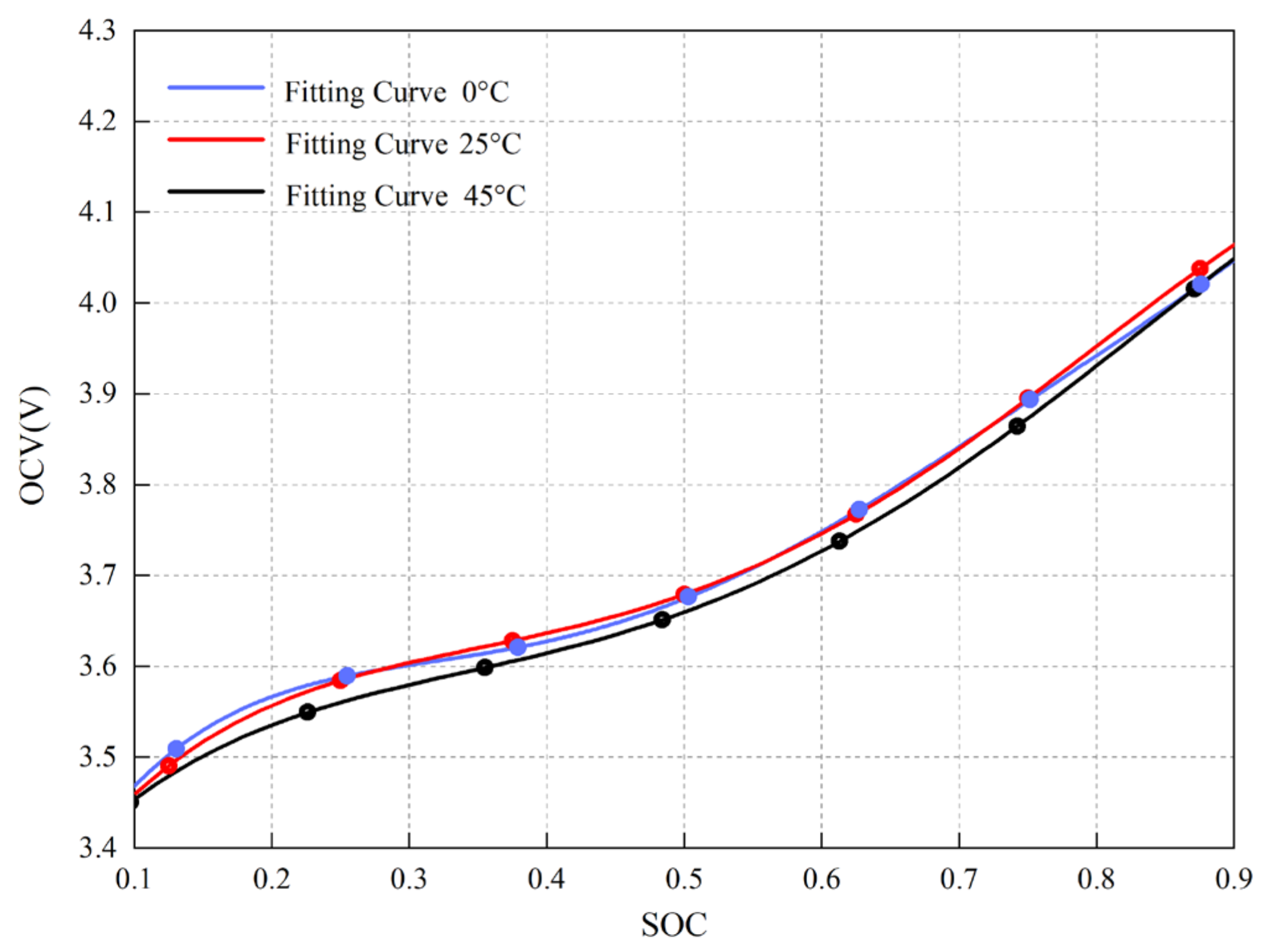 The relationship between a battery’s OCV and SOC constitutes a significant research subject in the study of battery electrical performance. The SOC refers to the percentage of the battery’s current stored electric quantity. The OCV is the voltage value across the battery terminals under no-load conditions. During the battery’s charging and discharging processes, the OCV varies with the changes in SOC. Thus, there exists a certain functional relationship between the SOC and OCV. This relationship is typically non-linear and takes the form of a complex curve. The battery’s voltage is influenced by multiple factors, such as chemical reactions within the battery, temperature, load, and historical charging and discharging conditions. It can usually be obtained through experimental measurements and represented by a fitting curve. In this study, experimental data from the incremental current open-circuit voltage (OCV) test were used for polynomial fitting of different orders. The optimal order of the polynomial fitting was selected by analyzing the experimental results.