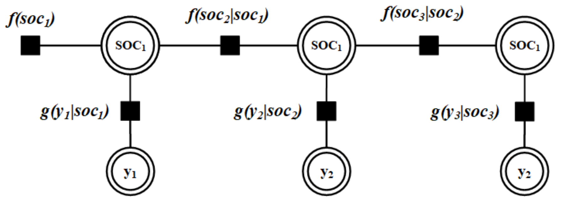 The Hidden Markov Model (HMM) is a statistical framework for time-series analysis. It performs well in modeling dynamic systems with hidden states. The HMM infers the hidden states of the system through the observed data. It is suitable for describing the variation process of SOC. Meanwhile, the Factor Graph (FG) is an effective probabilistic graphical model that can represent the dependencies between variables and enables efficient inference and state estimation using message-passing algorithms [