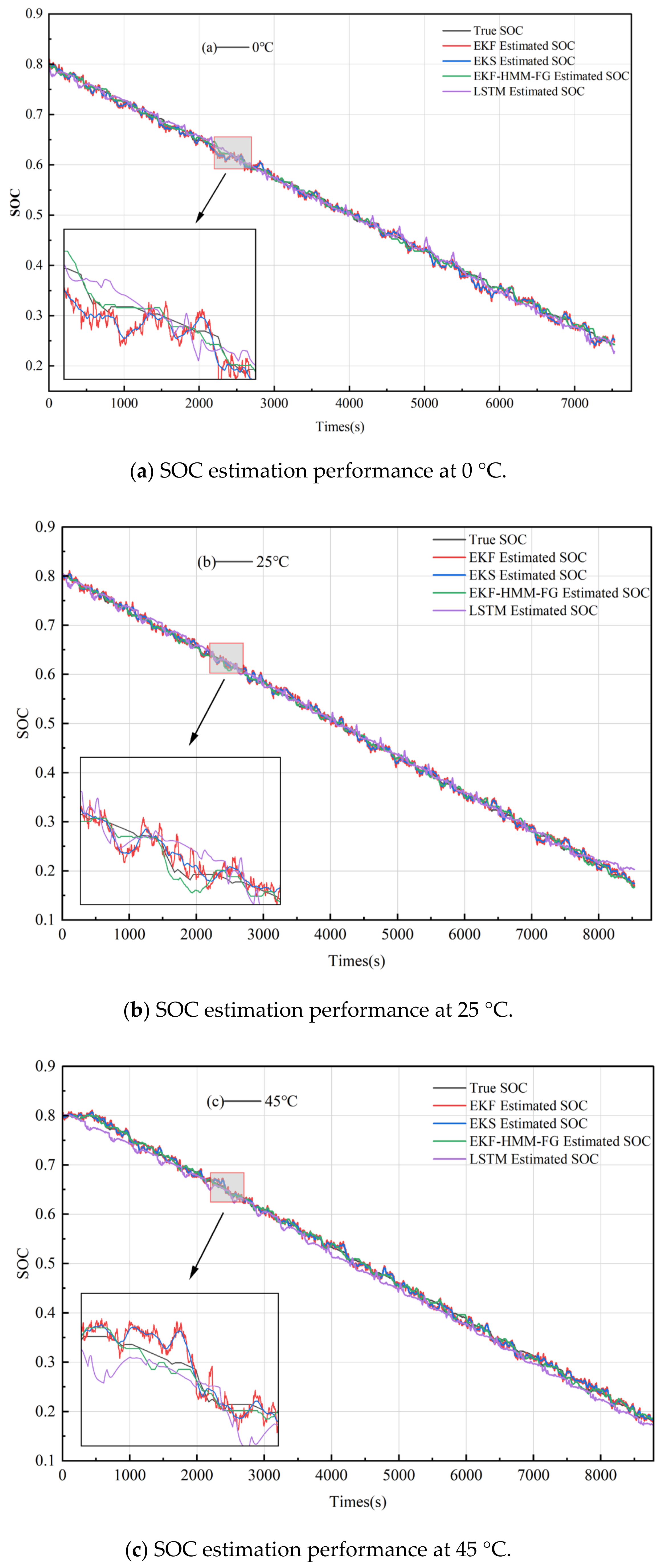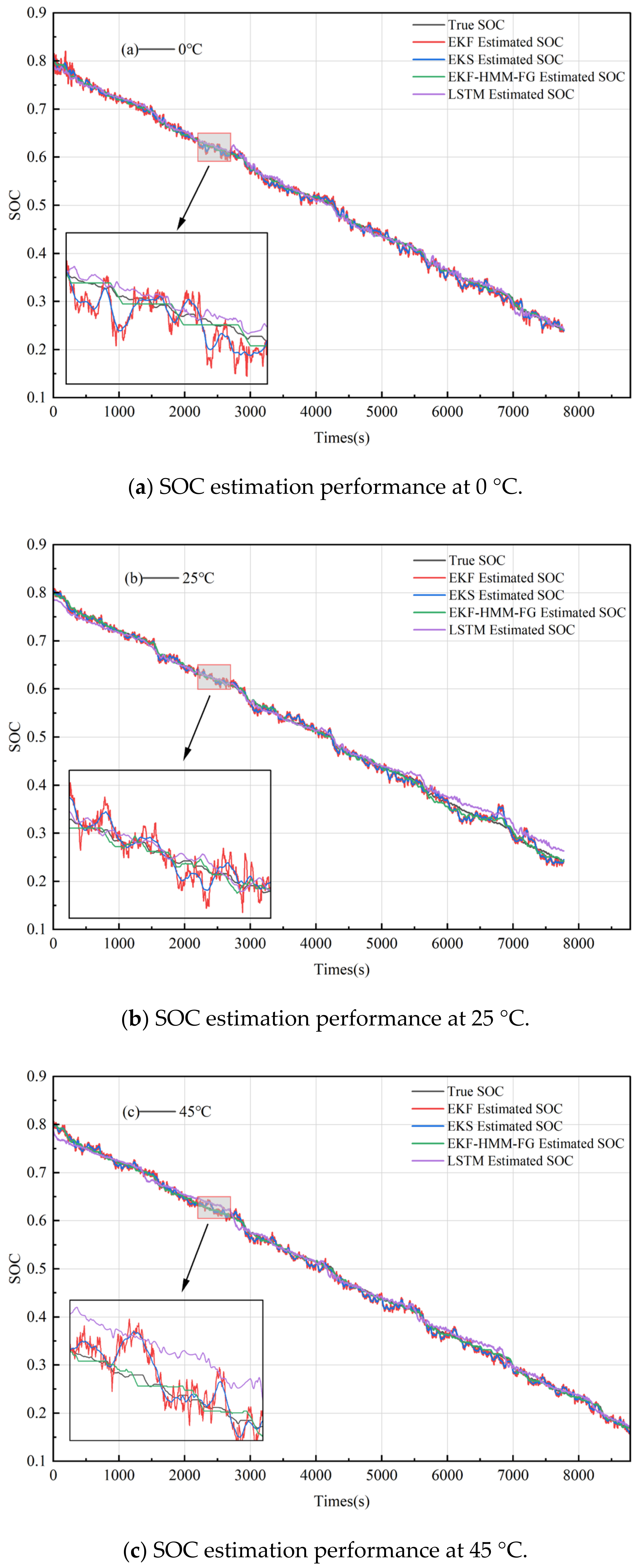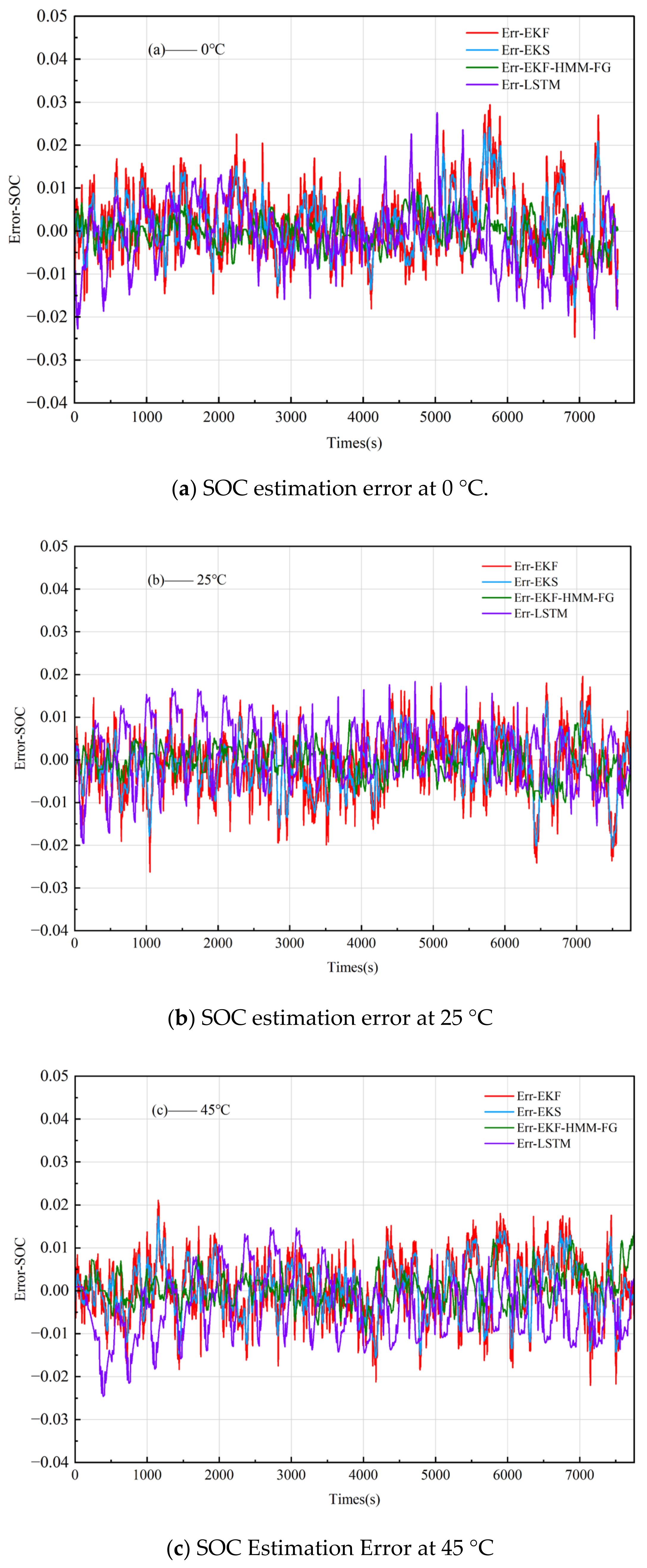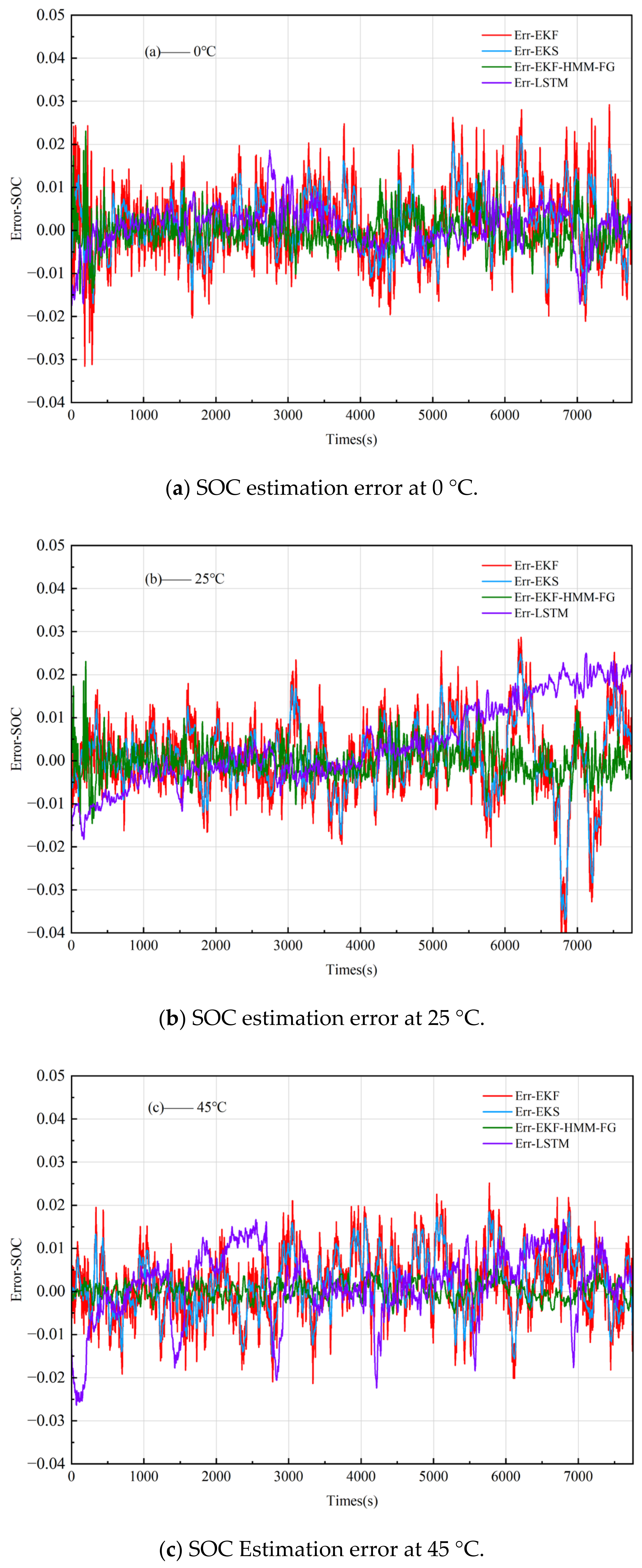 To verify the effectiveness and robustness of the proposed method, this study conducted a comparative analysis between the EKF–HMM–FG method and three benchmark methods: EKF, Extended Kalman Smoother (EKS), and the LSTM-based data-driven method. The focus was on evaluating their estimation accuracy and volatility performance under different temperature conditions and operating profiles.