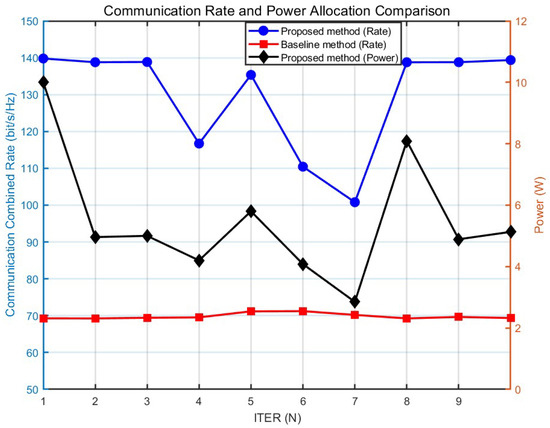 For convenience, 10 sets of transmission rates and power data were randomly selected from 100 iterations, as shown in Figure 4. In the transmission rate iteration comparison chart (proposed method vs. baseline method), the transmission rate of the proposed method rapidly converges to above 100 bit/s/Hz as the number of iterations increases, whereas the traditional method only achieves approximately 70 bit/s/Hz. This advantage stems from the joint optimization mechanism of the beamforming matrix and power allocation—by dynamically aligning with the main lobe direction of the channel and optimizing power resource allocation, the system attains higher spectral efficiency (SE) under the same transmit power constraint, thereby validating the effectiveness of the objective function aimed at maximizing system transmission efficiency.