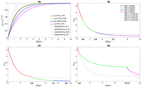 An illustration of proportion treated curves and outcomes under different stage-specific control (SSC) strategies. (A) Example proportion treated curves in the diminishing returns case, with solid curves showing asymptotic behavior and dashed lines representing linear approximations. (B) The population growth rate when SSC efforts are allocated according to Formula (8); switching between SSCs occurs at efforts , , and (solid vs. dashed curves indicate improved outcomes when switching). (C) The population growth rate when SSC efforts are allocated by numerical optimization algorithms, with switching at , , and (again, solid vs. dashed curves indicate improved outcomes when switching). Comparing (B,C), the formula strategy yields lower growth rates for between 0.9 and 3.8, while optimization yields the best final result at . (D) An example outcome when SSC order and effort allocation are random, leading to poorer performance (final growth rate ). For illustration we use the empirically estimated annual growth rate (from [22]) together with a representative set of realistic but hypothetical values chosen to best demonstrate the method, while noting that the framework itself is compatible with any empirically derived controls. All curves are obtained by plotting the corresponding functions or by simulations/optimizations as described in Methods and Calculations (Appendix A) (with full MATLAB 2025a code available, see Data Availability Statement).