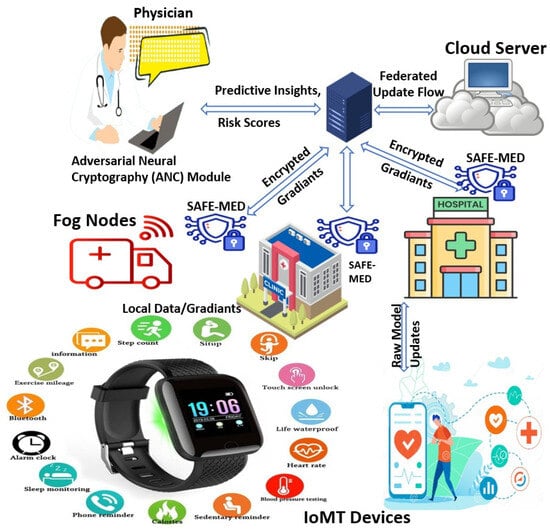 Figure 1 illustrates the overall architecture of the proposed SAFE-MED framework. The system is structured in a hierarchical manner, comprising IoMT devices, fog nodes, and a centralized cloud platform. Each fog node integrates a SAFE-MED module responsible for encrypting and validating gradient updates before forwarding them to the cloud.