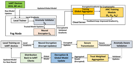 - Insider Adversary (Malicious Fog Node): A compromised fog node may access subsets of encrypted updates but is prevented from observing plaintext gradients due to the neural encryption mechanism. SAFE-MED mitigates this risk via trust-weighted aggregation and anomaly detection at both fog and cloud layers.