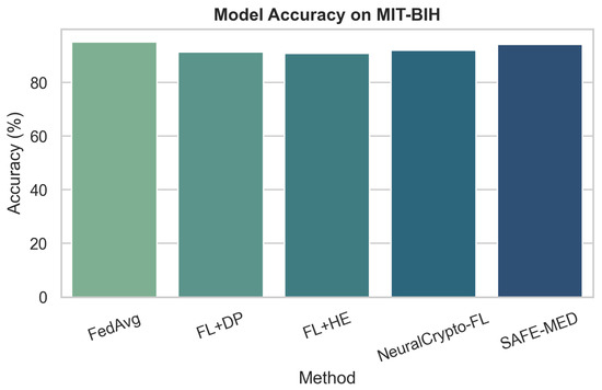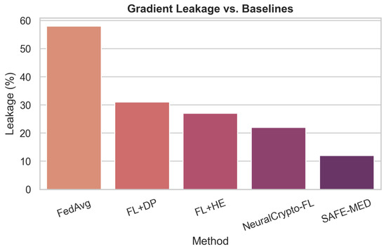 Despite incorporating cryptographic and adversarial processing, SAFE-MED maintains accuracy within 1–2% of vanilla FedAvg. On the MIT-BIH dataset, it achieves 94.2% accuracy, with 87.4% and 91.3% on the Cleveland and PhysioNet datasets, respectively. These results demonstrate that privacy-preserving enhancements incur only marginal utility loss. SAFE-MED further reduces gradient leakage risk by up to 85% relative to FedAvg and improves protection by 66% compared to NeuralCrypto-FL, confirming the effectiveness of its adversarial neural encryption.