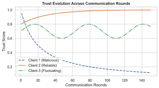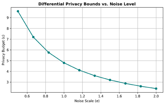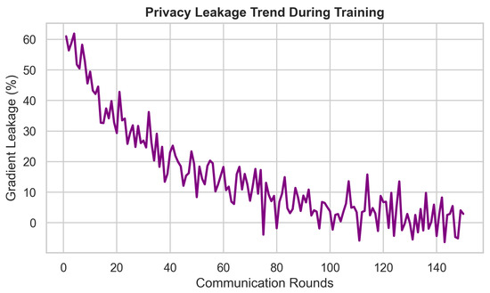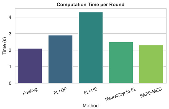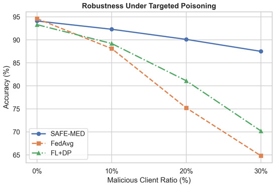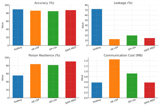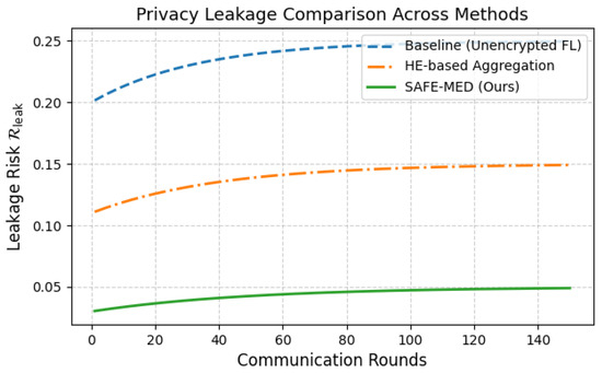 For hybrid baselines, we followed the configurations reported in prior work. Homomorphic encryption (HE) combined with differential privacy (DP) has been shown to provide strong leakage reduction but typically incurs high computational and communication overheads, particularly in IoT settings [31,32,33]. Lightweight Paillier-based HE introduces ciphertext expansion of up to 2–3×, which is consistent with our observed communication cost of 1.45 MB per round. Similarly, combining differential privacy with secure aggregation (DP + SA) [16,34] reduces leakage but leads to utility loss under non-IID conditions due to compounded DP noise. The accuracy degradation (2–5%) and moderate poisoning resilience (80–82%) observed in our experiments are in line with these prior studies. To ensure fairness, all baselines were re-implemented under identical IoMT settings, and the comparative outcomes confirm that SAFE-MED achieves a more favorable privacy–utility–efficiency trade-off.