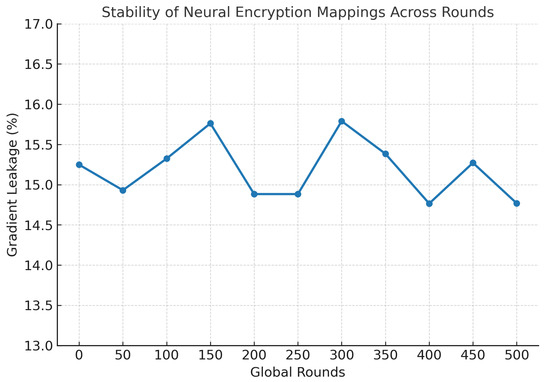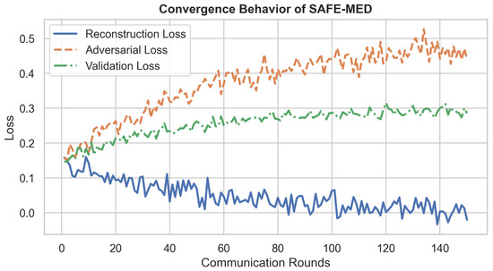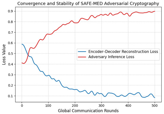 As shown in Figure 22, the encoder–decoder reconstruction loss steadily decreases and stabilizes within the first 80–100 communication rounds, while the adversary’s inference loss increases initially and then plateaus at a relatively high value. This behavior indicates that the encryptor–decoder pair successfully learns a stable mapping that preserves gradient utility for aggregation, while simultaneously maintaining robustness against adversarial inference attempts. Importantly, the absence of oscillatory behavior or divergence confirms that the adversarial training process converges reliably without pattern collapse. These results demonstrate that SAFE-MED achieves stable cryptographic dynamics even under non-IID client data distributions and heterogeneous participation, ensuring resilience and robustness in practical IoMT deployments.