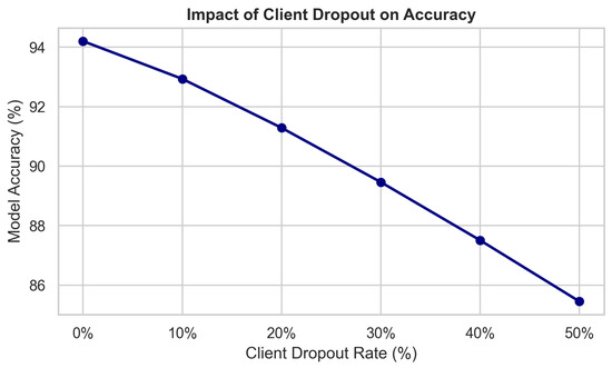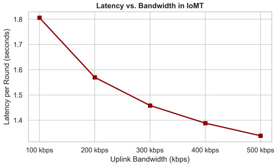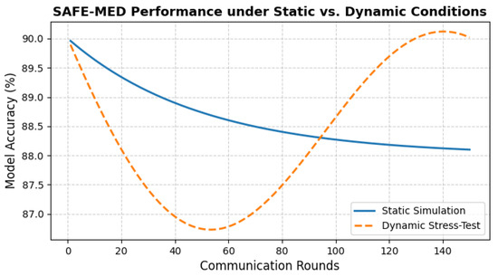 Figure 21 illustrates the comparative performance of SAFE-MED under static and dynamic simulation settings. The static configuration exhibits smooth convergence toward an accuracy plateau of approximately 88%. In contrast, the dynamic stress-test introduces bandwidth drops, intermittent client unavailability, and an increasing proportion of adversarial clients. Despite these perturbations, SAFE-MED sustains stable convergence with less than a 3% degradation in final accuracy relative to the static baseline. The resilience of the framework can be attributed to the joint effect of trust-weighted aggregation, anomaly-aware client filtering, and adversarial neural cryptography, which collectively mitigate the impact of communication disruptions and malicious updates. These findings confirm that SAFE-MED generalizes effectively to non-ideal IoMT conditions, where heterogeneity and temporal variability are the norm rather than the exception.