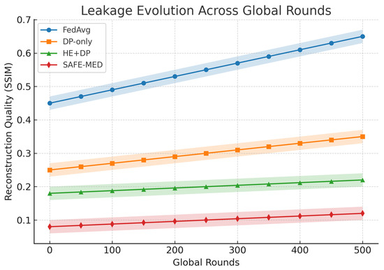 To provide a more rigorous evaluation of privacy leakage, we extended our analysis beyond cosine similarity and included Structural Similarity Index Measure (SSIM) as a standard metric of reconstruction quality. Figure 20 shows the evolution of SSIM-based reconstruction accuracy for four methods: FedAvg, DP-only, HE + DP, and SAFE-MED, across 500 global rounds. The results indicate that FedAvg suffers from consistently high leakage (SSIM ≈ 0.70), while DP-only reduces leakage but with high variance due to noise sensitivity. HE + DP achieves stronger leakage reduction (≈0.25 SSIM) but at significant computational overhead. In contrast, SAFE-MED maintains consistently low leakage (<0.15 SSIM) with stable confidence intervals, confirming robust privacy protection against reconstruction attacks over multiple rounds. These findings reinforce SAFE-MED’s ability to provide reliable resilience against gradient inversion and membership inference attacks in practical IoMT deployments.