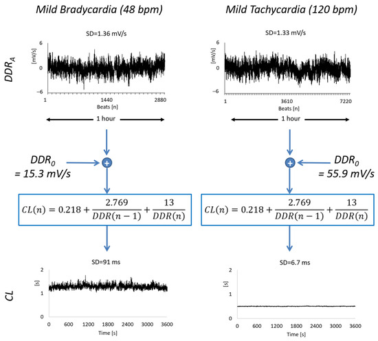 Example of synthesized series of beat-by-beat autonomic perturbations of diastolic depolarization rate, DDRA, and the corresponding series of cardiac cycle length, CL, of 1-h duration. The DDRA series are generated at mild bradycardia (HR0 = 48 bpm, corresponding to CL0 = 1.25 s, DDR0 = 15.3 mV/s in Equation (2), and 2880 samples) and mild tachycardia (HR0 = 120 bpm, CL0 = 0.5 s, DDR0 = 55.9 mV/s and 7200 samples). While the DDRA series have similar overall variability as quantified by their standard deviation, SD, the overall variability of the CL series differs by an order of magnitude.