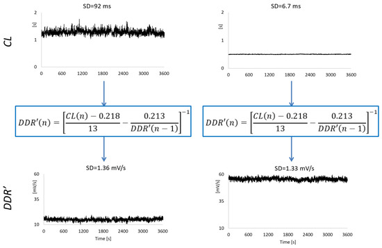 Equation (1) indicates how to estimate the diastolic depolarization rate, DDR′(n), from measured CL(n) series. Moving DDR(n) to the left side of Equation (1), we have
