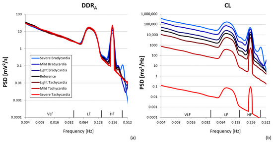 Power spectra of synthesized series. The series were generated using the seven mean HR levels from Table 1 and the resulting spectra are plotted with colored lines, where each color refers to a different mean HR: the spectra at the reference heart rate are plotted by black lines; spectra at HR reproducing conditions of light, mild, and severe bradycardia by dark blue, blue, and light blue lines; and spectra at HR reproducing conditions of light, mild, and severe tachycardia by dark red, red, and bright red lines. (a) refers to spectra of autonomic perturbations of diastolic depolarization rate, DDRA, series; (b) to spectra of corresponding CL series, output of the model of Equation (1).