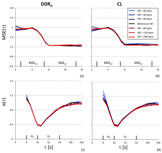 Figure 4 aims to show whether the metrics used in HRV analysis to quantify the unpredictability of a time series, i.e., the multiscale entropy, MSE(τ), or its self-similarity, i.e., the temporal spectrum of DFA coefficients, α(τ), produce different results when applied on the synthesized autonomic modulation series, DDRA, or on the corresponding CL series, output from the model of Equation (1). Figure 4 shows that both MSE(τ) and α(τ) do not depend on mean HR and have the same shape for CL and DDRA. This is confirmed by the αS, αL, MSEHF, MSE7, and MSELF values in Table 2, remarkably stable among mean HRs. However, Table 2 also points out that the fractal indices defined on block sizes (i.e., α1 and α2) and the entropy indices defined on the beat scales (i.e., SE, SE5, CIS, and CIL) are more sensitive to mean HR than fractal (αS and αL) and entropy indices (MSE7, MSEHF, and MSELF) defined on the temporal scale.