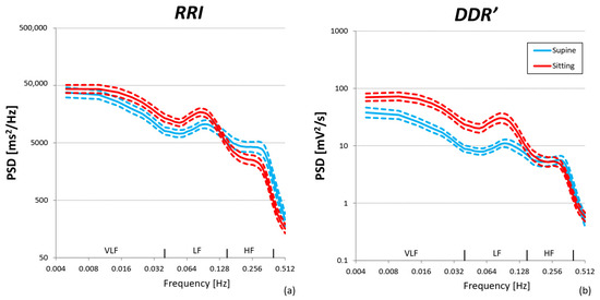 Power spectra in supine and sitting postures over N = 30 participants: geometric mean (solid line) ± geometric standard error of the mean (dashed lines). (a) RRI series; (b) DDR′ series estimated from RRI.