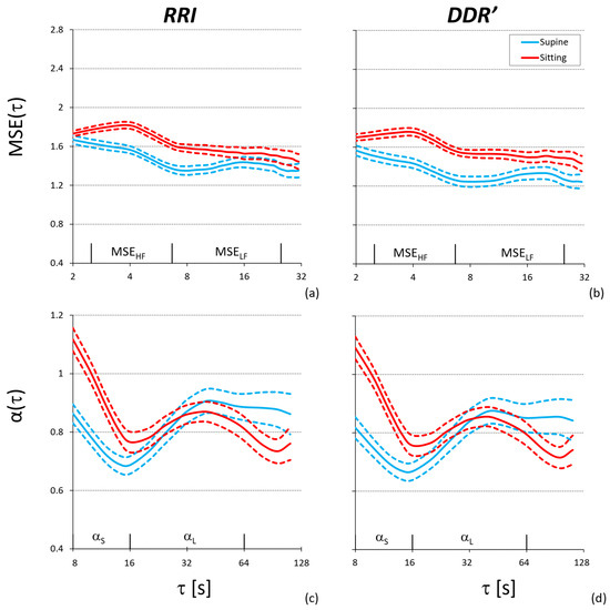 Complexity analysis in the supine and sitting posture over 30 participants: mean (solid line) ± standard error of the mean (dashed line). Multiscale entropy of RRI (a) and RRI-derived DDR′ (b); temporal spectrum of DFA scale coefficients of RRI (c) and RRI-derived DDR′ (d).