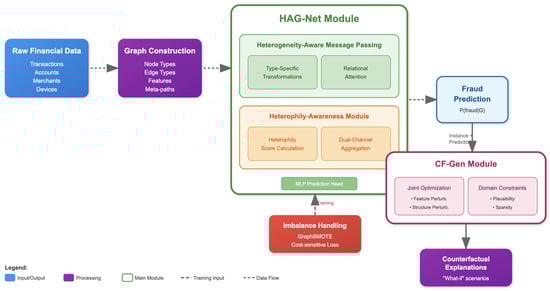 The overall architecture of HAG-CFNet. The framework follows a modular design pipeline. (1) Raw data is transformed into a heterogeneous graph. (2) The core HAG-Net model, featuring heterogeneity-aware message passing and dual-channel heterophily detection, learns robust node embeddings. This process is supported by a synergistic imbalance correction strategy. (3) A prediction head outputs fraud probabilities. (4) The CF-Gen module analyzes predictions to generate interpretable counterfactual explanations. This end-to-end design ensures that the model is not only accurate but also robust to adversarial camouflage and transparent in its decision-making.