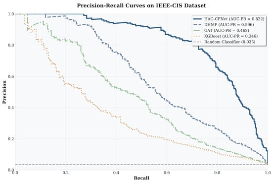 Precision–recall curves on the IEEE-CIS dataset. This figure visualizes the trade-off between precision and recall. The curve for HAG-CFNet (blue) consistently remains above all baselines, and its larger area under the curve (AUC-PR) quantitatively confirms its dominant performance. The significant gap between HAG-CFNet and other methods, especially at high-recall regions, underscores its effectiveness in identifying the rare fraud class, which is critical for practical applications.