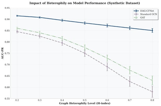 Impact of the heterophily level on model performance. This simulation study on synthetic data demonstrates HAG-CFNet’s superior robustness to increasing heterophily (a lower rate of performance decay) compared to a standard GCN. This validates the effectiveness of our dual-channel heterophily detection module in adversarial environments.