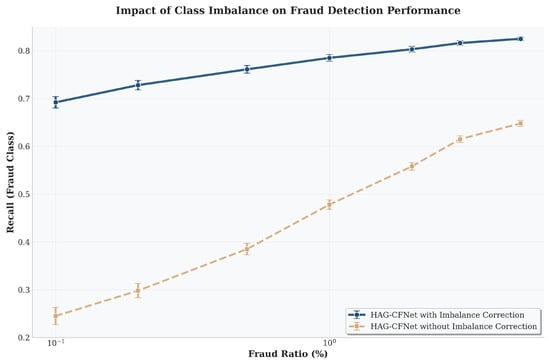 The imbalance sensitivity analysis in Figure 4 demonstrates the critical importance of specialized imbalance handling in fraud detection scenarios. The dramatic performance gap between HAG-CFNet with and without imbalance correction (0.75 vs. 0.30 recall at a 0.1% fraud ratio) illustrates how extreme class imbalance can render even sophisticated models ineffective without proper mitigation strategies. The widening performance gap at lower fraud ratios (more realistic scenarios) suggests that traditional approaches to minority class learning become increasingly inadequate as fraud becomes rarer—a concerning trend given that successful fraud prevention often reduces overall fraud rates. Interestingly, the convergence of both curves at higher fraud ratios (3%) indicates that imbalance correction becomes less critical when fraud is more prevalent, suggesting that the primary challenge lies in detecting sparse fraud signals rather than distinguishing fraud from benign when both classes are reasonably represented. This finding has practical implications for fraud prevention systems: as these systems become more effective and fraud rates decrease, the importance of sophisticated imbalance-handling mechanisms actually increases, creating a technological arms race where better fraud prevention necessitates even more advanced detection capabilities.