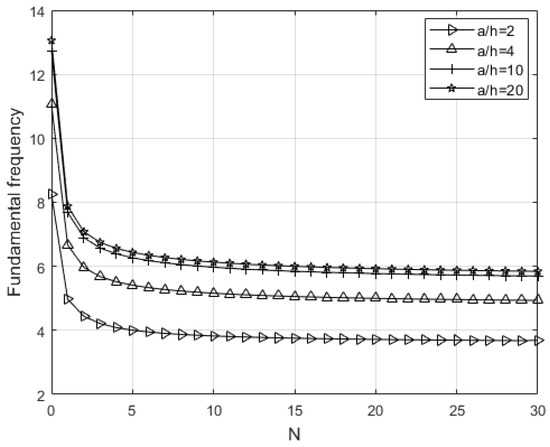 N > 10. This effect can be attributed to the redistribution of mass and stiffness within the FGM plate: higher