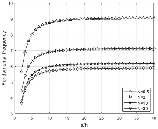 On the other hand, the analysis of the frequency dependence on the gradient exponent N, which characterizes the distribution of material properties, shows an initial sharp decrease in frequency at low values of N, followed by stabilization. This saturation suggests that within a certain range of N values, the effect of the gradient on the dynamic response practically saturates, especially pronounced in thicker plates (with smaller a/h ratios).
