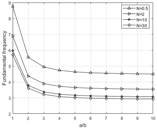 However, the rate of this increase depends on the value of the parameter N, higher values of N (indicating a greater concentration of material with weaker mechanical properties in the lower region of the plate) are associated with lower values of fundamental frequency. This highlights the significant effect of material distribution on the dynamic response of the plate, further confirming the importance of incorporating functionally graded materials in engineering applications.