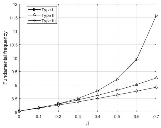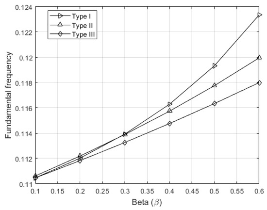 β leads to a rise in the natural frequency for all distributions, with the most pronounced effect observed in the Type III distribution.