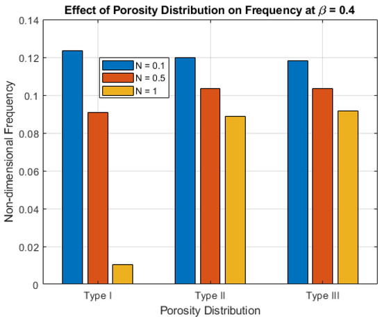 N = 0.1. The diagram clearly confirms that the frequency increases with rising β for all distribution types, which is a direct consequence of the reduction in effective material mass due to porosity, while the stiffness remains the dominant factor. The differences among the distributions become more pronounced at higher