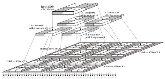 Figure 1 illustrates the hierarchical architecture of the proposed SOMTreeNet model. At the top level, a root SOM is composed of four neurons, labeled 1 through 4. Each neuron in the root SOM may serve as a parent to a child SOM, enabling the recursive expansion of the structure. In this example, neurons 1, 2, 3, and 4 of the root have each instantiated child SOMs, denoted as 1.1, 2.1, 3.1, and 4.1, respectively. Each of these child SOMs also follows the standard layout, comprising four neurons each. This recursive pattern continues to a third hierarchical level, where the neurons of the second-level SOMs give rise to 16 distinct child SOMs, resulting in a total of SOMs. Given that each of these leaf-level SOMs, again, consists of four neurons, the architecture at this depth accommodates a total of neurons. This figure exemplifies the tree’s quad-branching structure and highlights the model’s ability to adaptively grow based on data complexity while maintaining the interpretability and modularity of localized SOM units.