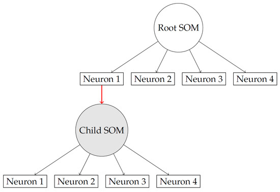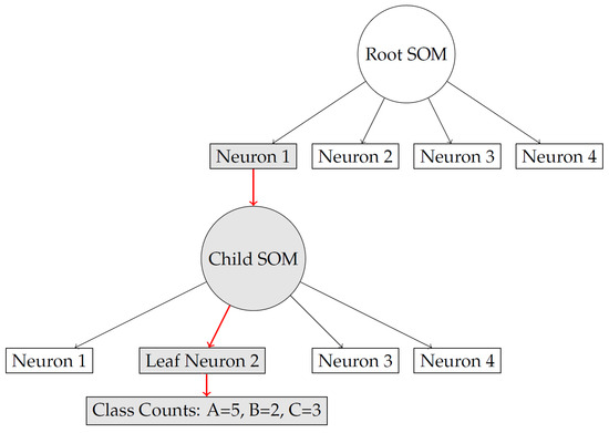Each node in SOMTreeNet is a compact SOM with a fixed size of , meaning that it contains exactly four neurons. This configuration is the default and minimal building block of the architecture, designed to provide both topological flexibility and computational efficiency. The use of units allows the tree to grow in a quad-branching fashion, where each neuron may become the parent of another SOM, thereby creating a recursive structure capable of adapting to data complexity.