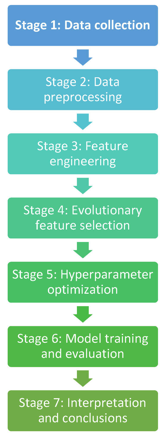In the fifth stage (Stage 5: Hyperparameter optimization), the hyperparameters of the model were optimized through an evolutionary approach, enabling the identification of optimal settings that improved predictive performance. The sixth stage (Stage 6: Model training and evaluation) included training and validating the final model, assessing its effectiveness.
