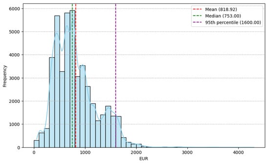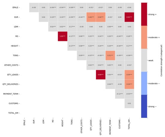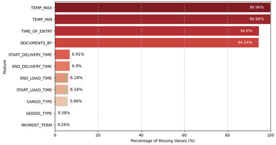Figure 2 presents the distribution of missing values across variables. Missing values in the variables “TEMP_MIN” and “TEMP_MAX” are justified due to the nature of the goods transported, as only some products require controlled temperature. Missing values in “DOCUMENTS_BY” indicate that the preferred method of delivering documents (post or email) was often not recorded. The timestamps (“START_LOAD_TIME”, “END_LOAD_TIME”, “START_DELIVERY_TIME”, and “END_DELIVERY_TIME”) contain gaps arising from the incomplete registration of loading and unloading events. Missing values in “CARGO_TYPE” and “GOODS_TYPE” result from occasional incomplete shipment documentation, while “PAYMENT_TERM” and “TIME_OF_ENTRY” also exhibit gaps due to incomplete or unregistered entries. The identified missing values will be addressed after feature engineering, as explained in later sections.