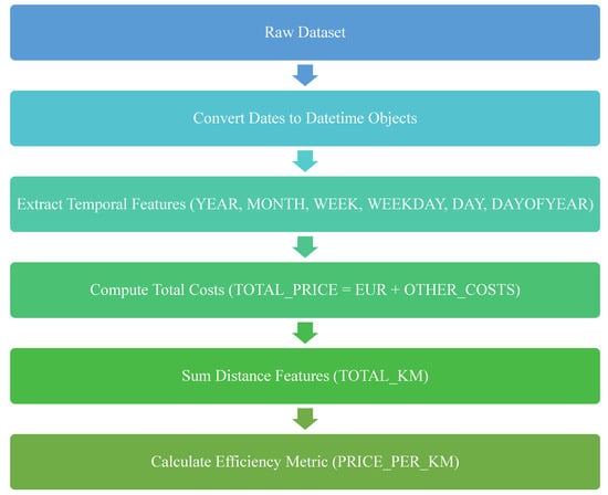 Feature extraction plays an important role in preparing data for evolutionary machine learning models. To improve the models’ predictive performance and simplify analysis, several new features were carefully created from the original dataset. The dataset that we used contains 45,569 observations from real-world road freight transport orders, with each observation characterized by various numerical, categorical, and temporal attributes. A clear, step-by-step overview of the entire feature extraction process is presented in Figure 3.