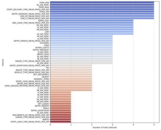 This study’s dual application of evolutionary algorithms for feature and hyperparameter optimization is among its most significant contributions. By successfully reducing the original feature set from 57 to 21–25 variables per fold, this biologically inspired method enhanced model clarity and computational efficiency. This is in line with [], which showed that, when working with big, noisy, and interdependent datasets, evolutionary strategies perform better than conventional selection techniques. The significance of incorporating operational, environmental, and temporal dimensions into freight pricing models is highlighted by the most commonly chosen features, including TOTAL_KM, TEMP_MIN/MAX, and time-aggregated variables.
