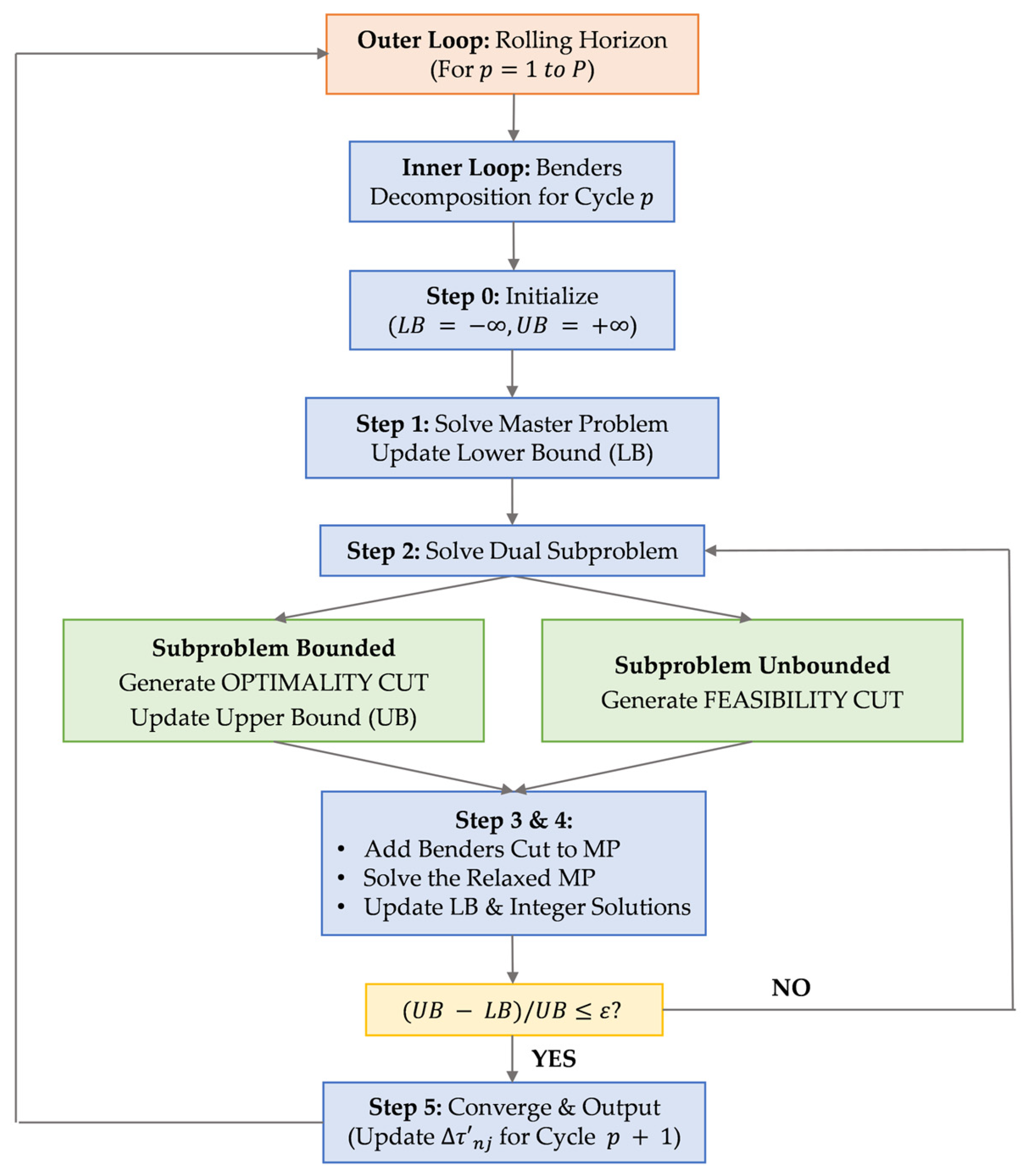 - If no feasible solution exists, determine the extreme direction of the dual subproblem. Using Constr.FarkasDual, Gurobi is called to obtain the dual variables associated with the infeasibility, constructing a feasible cut by substituting into Equation (49) and adding it to the relaxed master problem. This Benders cut excludes the current , and that lead to infeasibility in subsequent iterations.