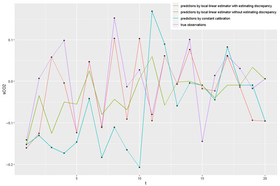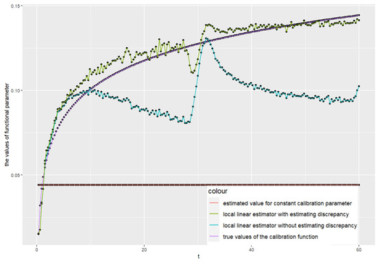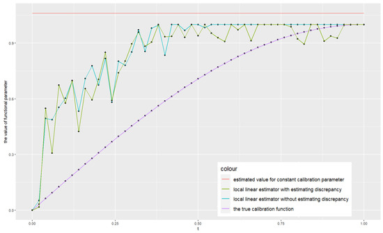 Referring to [20], we set and with . In addition, we assume that there exists a discrepancy between the above model and the true process with and the random error follows a normal distribution . Similarly to in Section 4.1, we also utilize the MSE and MAPE to measure the performance of the estimators of the calibration function, which are shown in Table 2.