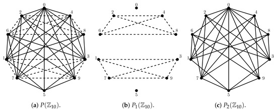 The additive group is a cyclic group of order 10. Thus, the subgroups of are of orders and 10. Since the elements of the set generate itself, the corresponding vertices will be adjacent to the rest of vertices in , while they form a clique in . Similarly, the vertices form a clique in , while each one of them is adjacent to 0 in . Finally, 0 and 5 are adjacent in .