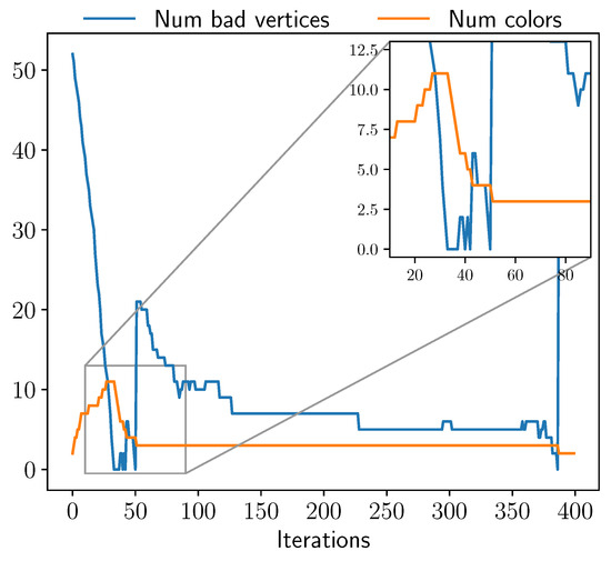 Graph coloring is computationally hard. It is well known [16] that for it is NP-complete to decide if a given graph has a proper k-coloring, and that it is NP-hard to compute the chromatic number. It is also hard to find approximate solutions for the graph coloring problems. In particular, recently NP-hardness of coloring k-colorable graphs with colors was shown [17], improving previously strongest results of Bulín et al. [18], who show that is it NP-hard to color k-colorable graphs with colors, and of Huang et al. [19] who gave NP-hardness of coloring k-colorable graphs with colors for sufficiently large k. Due to the intractability of graph coloring, many algorithms including various heuristics and metaheuristics approaches have been designed and applied; for example, ref. [20]. In 1989, likely inspired by the Ising model in statistical mechanics, Petford and Welsh [21] proposed a simple randomized heuristic algorithm for coloring a graph with three colors that “does seem to work well in a wide variety of graph cases”.