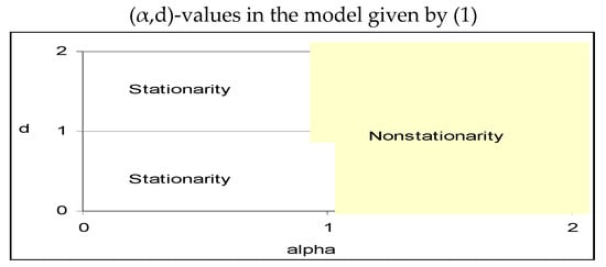 with |α| < 1 and d > 0. For simplicity, we assume that ut is i.i.d. Clearly, if α = 1 in (1), xt is I(d) and exhibits long memory since d > 0 []. However, if |α| < 1, the process is no longer characterized by long memory, although xt will still be a function of its infinite past as long as d is a real value. Thus, the main contribution of this work is the specification of a novel model that combines both autoregressions with fractional differentiation in a single framework; however, instead of considering a fractional process with autoregressive disturbances (e.g., as in []), we incorporate the autoregression in the fractional polynomial. In doing so, we allow for a more flexible specification of the model, incorporating stationary and nonstationary structures with different degrees of dependence across time.