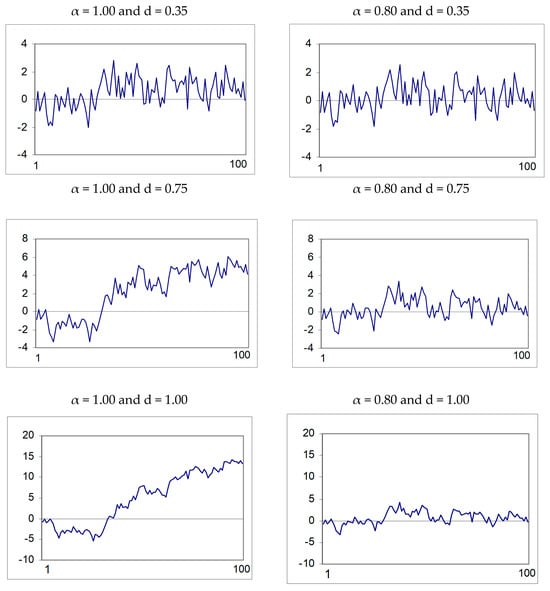 Simple realizations of models of the form (1 − αL)dxt = εt. The plots are sample realizations of the model in Equation (1) for a range of values for α and d.