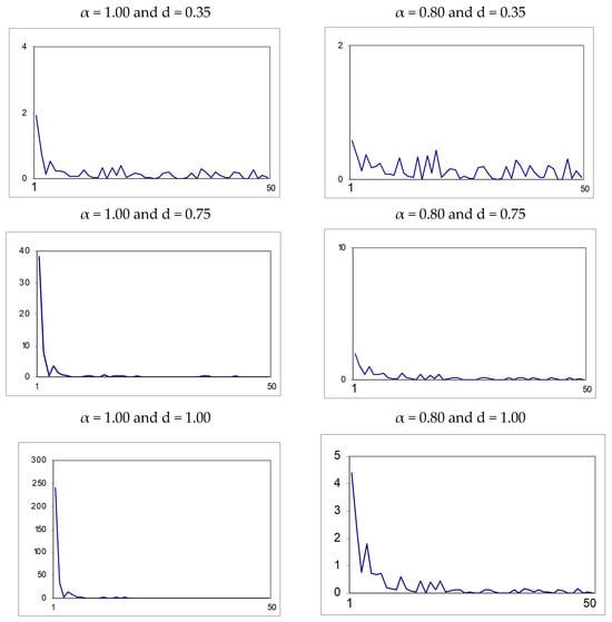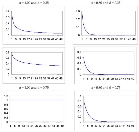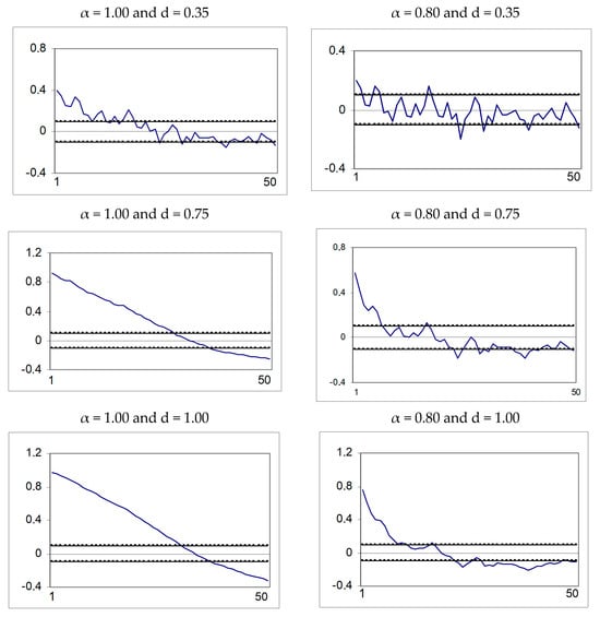Figure 5 displays the impulse response functions obtained from the coefficients of the infinite MA representation in (7). As expected, mean reversion occurs in all cases except when α = d = 1 (the random walk model). These values correspond to the coefficients bj in the MA(∞) representation of xt in (7). This figure shows that when increasing α and d, the impulse responses have a longer time horizon before disappearing completely.
