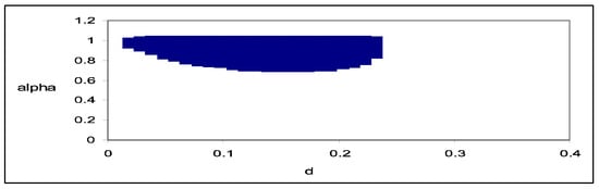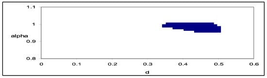 We perform the procedure described in Section 3, first testing Ho (6) in the model given by (1) for the following (αo, do)-values: αo = 0.01, 0.02, …, 1; do = 0.01, 0.02, …, 2. From all these combinations there emerges only a single case when Ho (6) cannot be rejected at the 5% significance level—this corresponds to αo = 1 and do = 0.72, which is consistent with the long-range dependence observed in the series. Next, we also consider two specifications including, respectively, an intercept only and an intercept as well as a linear time trend. These two sets of results are very similar, and thus we only report in Figure 6 those based on the model with an intercept only. It can be seen that the non-rejection values of d range between 0.35 and 0.50 and occur when αo is in the interval [0.95, 1]. In the case of no regressors, d is higher than 0.5, which implies nonstationarity, while in the cases of an intercept and/or a linear time trend, d appears to be smaller than 0.5 and thus implies stationarity. We would argue that the specifications with deterministic terms are preferable, since the model without regressors assumes a zero mean for the series, whose values are instead all positive. Moreover, the former produce results which are consistent with those of [], who examined the same series using ARFIMA models and concluded that the fractional differencing parameter d was around 0.40 with a 95% confidence interval of (0.34, 0.46).