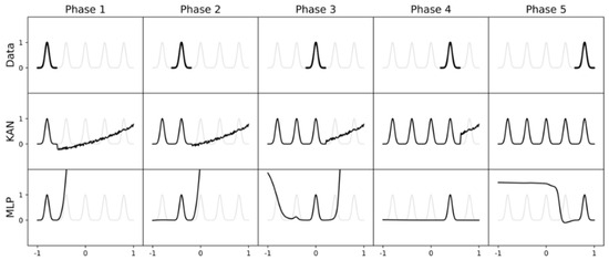 Catastrophic forgetting MLP vs. KAN. The MLP waveforms become distorted as new phases are introduced, indicating catastrophic forgetting, whereas the KAN waveforms remain consistent across subsequent phases, showing better retention of knowledge across phases.