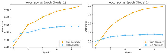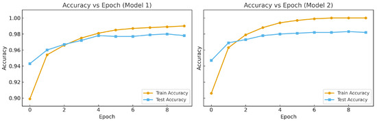 In Figure 10, both models show rapid improvement in training and test accuracy during the initial epochs, with the training accuracies nearing 100%. However, EfficientKAN consistently achieves slightly higher test accuracy compared to MLP throughout the epochs. This suggests that EfficientKAN generalizes better to unseen data, maintaining better performance across training iterations.