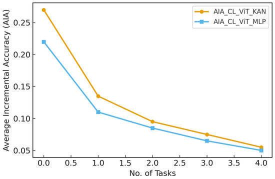 Average incremental accuracy (AIA) across sequential tasks on the TinyImageNet-200 dataset, comparing ViT_KAN and ViT_MLP models in a continual learning setting. ViT_KAN consistently outperforms ViT_MLP, indicating better knowledge retention over tasks.