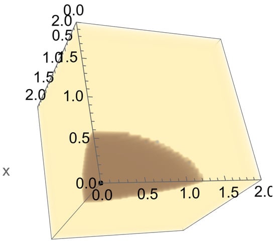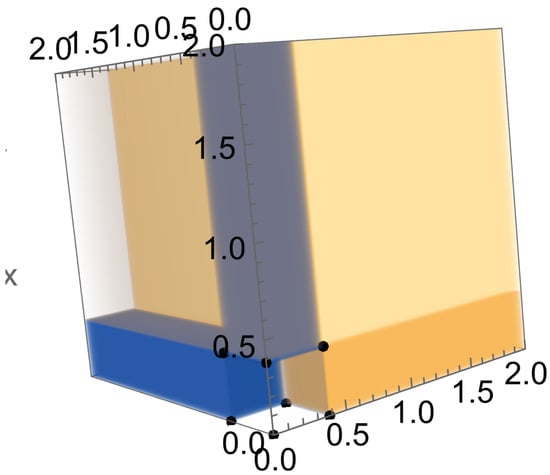 In general, local stability of the equilibrium solutions of difference equations of order higher than two is a complicated task, as Jury’s conditions [] for local stability are hard to check. But for this equation, we succeeded in accomplishing this. It is even more complicated to describe the global dynamics of such equations, due to the lack of global stability results for difference equations of order higher than two; see [] for some of the global stability results. Since Equation (1) generates a cooperative map, we were able to find substantial parts of the basins of attraction of locally stable equilibrium solutions. In the case of multiple locally stable equilibrium solutions, the recent result on the existence of global stable manifold for cooperative maps, which serves as the separatrix between different basins of attraction of locally stable equilibrium solutions, was used (see Theorem 3). The separatrix surface will contain all periodic points, as they cannot be parts of the basin of attraction of any equilibrium solutions. The periodic points of lower periods, such as two and three, can be found numerically by solving the system of functional equations provided in the sequel. We believe that the dynamics of Equation (1), in some region of parameters, resembles the dynamics of Equation (2) and the special case of Equation (1) with . In some other regions of parameters, the dynamics of Equation (1) could be chaotic, but this case is not discussed here. The objective is to find an efficient technique for describing the basin of attraction of cooperative maps in spaces with dimensions higher than two. The contribution is a successful description of the basin of attraction of Equation (1).