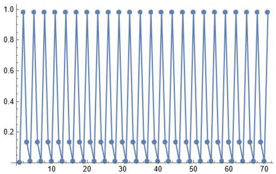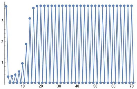 First 70 terms of the solution of with as a time series plot. The horizontal axis stands for n and the vertical axis stands for . The solution converges to period-two solution .